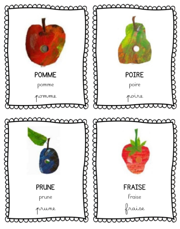 Des cartes de vocabulaire, type cartes de nomenclature avec les trois écritures. A télécharger ici.